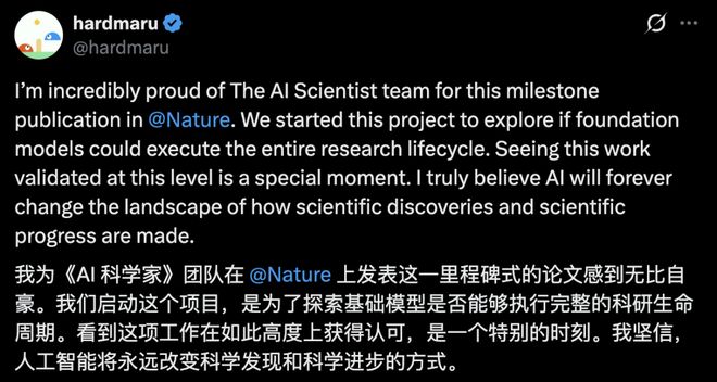 Sakana AI联合创始人兼 CEO David Ha在推文中表示,启动该项目,正是想探索大模型是否能够完成整个科研全流程: