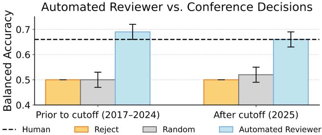 在与数千条真实OpenReview人类审稿决策的硬碰硬对比中,自动化审稿人交出了69%的平衡准确率。