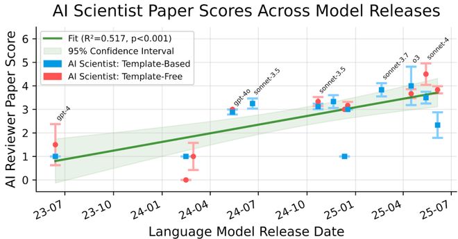 随着模型发布日期推进,AI产出的论文质量持续陡峭上升。