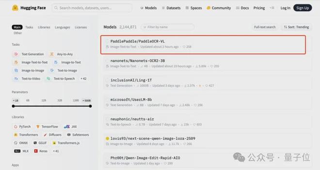 抱抱脸模型趋势榜一度被OCR模型“屠榜”。