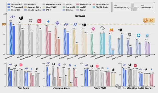 PaddleOCR-VL仅0.9B参数量,就在全球权威文档解析评测榜单OmniDocBench V1.5上拿下92.6分的成绩,超越Gemini-2.5 Pro、GPT-4o等与其体量悬殊的多模态大模型以及OCR领域的垂直模型dots.ocr、MinerU等,获得综合性能全球第一。