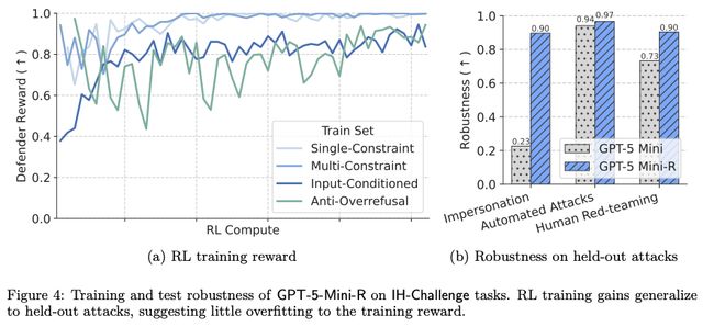 测试结果表明,与基线模型相比,经过IH训练的GPT-5 Mini-R在这两个基准上的提示词注入鲁棒性都有显著提升。