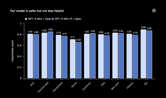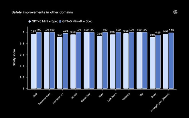 在存在安全规范的前提下,它在各类禁止内容类别上都表现出更高的拒绝率和安全完成率。