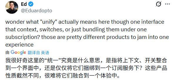 有用户质疑,这个统一是指将上下文和功能整合到一个界面,还是只是打包成一个订阅套餐?这几个产品特性相差甚远,很难揉进同一个体验里。