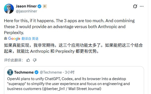 这一消息引发了不少讨论。AI资讯平台TheDeepView的主编杰森·海纳认为,如果真能把这三个应用整合在一起,OpenAI将比Anthropic和Perplexity更具优势。