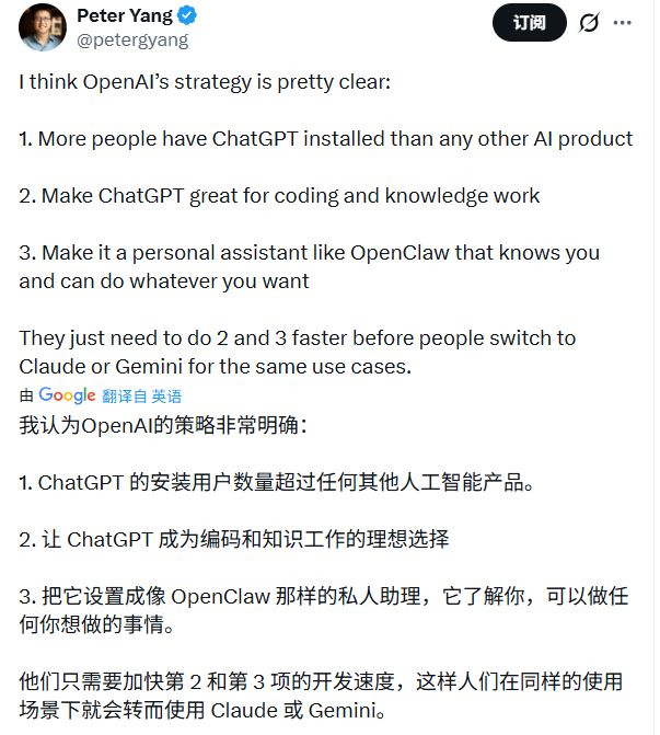 有网友总结得挺到位,OpenAI的路径其实很清晰:先用ChatGPT圈住最大的用户盘,然后往里面塞编码和知识工作的核心能力,最后把它打磨成真正懂你的私人助理。眼下最大的变数就是速度和执行力,因为Claude和Gemini也在红着眼抢夺同一个战场。