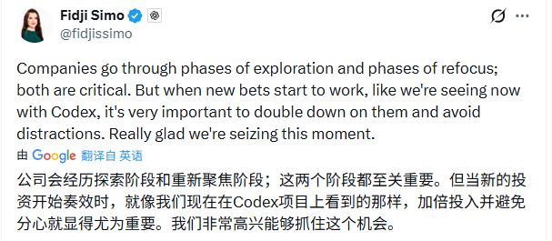 西莫在X上发帖解释称,公司都会经历探索阶段和重新聚焦阶段,两者都重要,但当新的赌注开始见效,像Codex这样的产品,加倍投入并避免分心就显得尤为重要。这些评论透露出强烈的紧迫感。