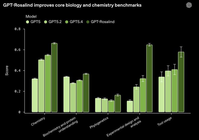 GPT-Rosalind在五项生物和化学基准测试中均取得了最高分,在实验设计和分析方面进步尤为显著。
