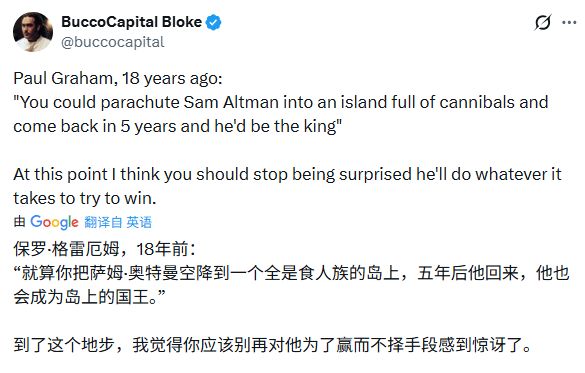 保罗·格雷厄姆(Paul Graham)作为Y Combinator的掌门人,也是奥特曼发迹早期的重要精神导师。早在2008年奥特曼只有23岁时,格雷厄姆就为他写下过一句极具前瞻性的判词,这句话后来在硅谷被奉为经典:“你可以把他空降到满是食人族的荒岛上,五年后再回去看,他绝对已经成了那里的国王。”