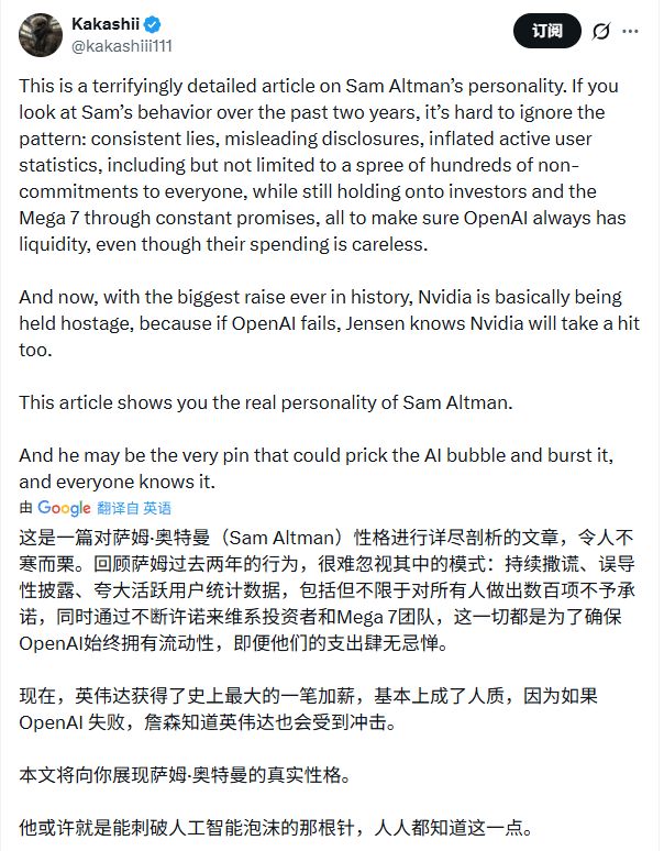 但资本市场的旁观者,显然早已看穿了这套粉饰太平的说辞。网友(@kakashiiii111)在社交平台上发表了一段令人脊背发凉的总结。回顾奥特曼过去两年的操盘轨迹,一条极其危险的行事模式已昭然若揭:持续撒谎、释放误导性信息、凭空捏造活跃用户数据。他通过向所有人许下无数根本不打算兑现的空头支票,来死死套牢投资者和合作伙伴。