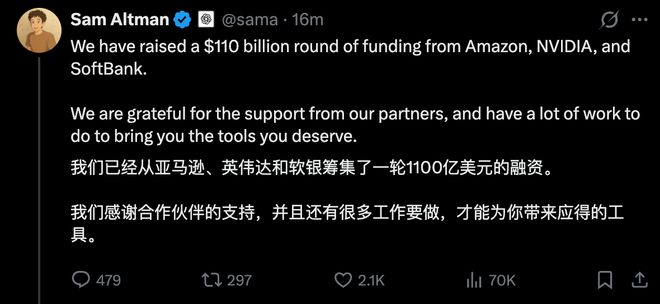 智东西2月27日消息,刚刚,OpenAI宣布拿到1100亿美元(约合人民币7544亿元)新融资,亚马逊投500亿美元、英伟达投300亿美元、软银投300亿美元。
