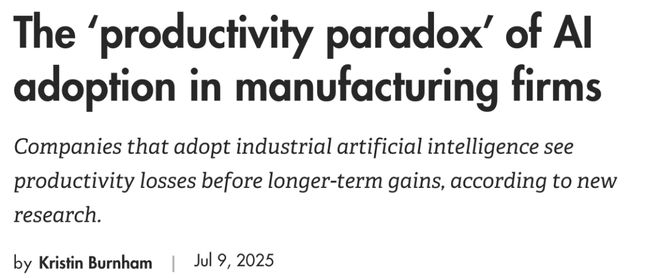 一项来自MIT的研究指出,在制造业引入AI并不是一蹴而就的事情,初期可能会经历生产率下滑的情况。