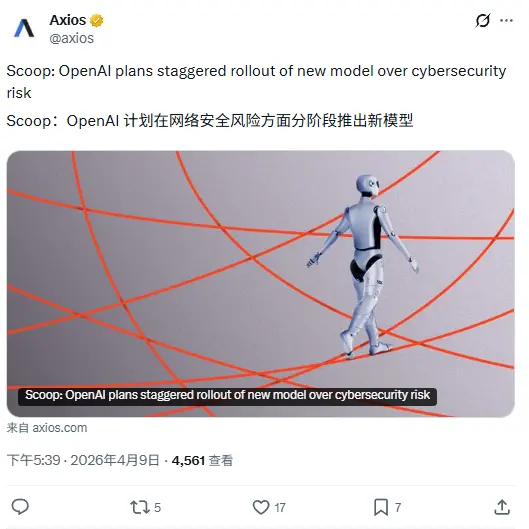 根据 Axios 的报道,知情人士透露,OpenAI 正在开发一款拥有高级网络安全功能的模型,并计划仅限于少数公司使用,这与 Anthropic 对其 Mythos 模型采取的策略相似。