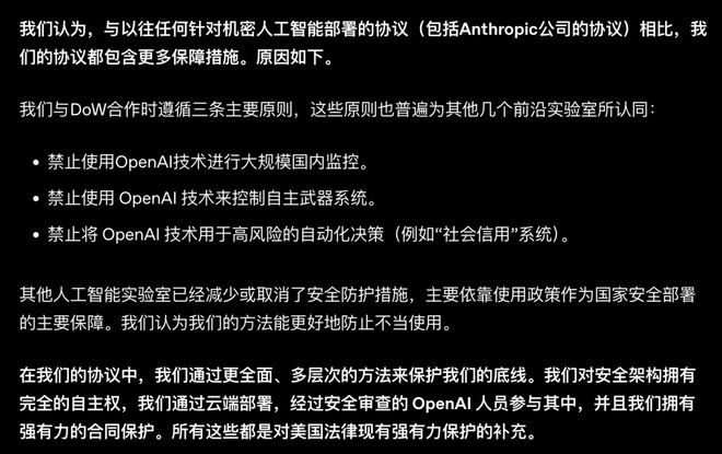 更令人愤慨的是,OpenAI 明确设立了完全相同的安全界限,仅仅通过强调「云端部署」来保障安全,就顺利接下了美国战争部的大单。