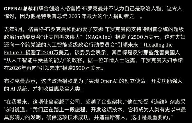 结合上个月 OpenAI 总裁 Greg Brockman 为特朗普团队捐赠了 2500 万美元(约合 1.7 亿元人民币),成为其最大捐助者之一的消息,这场权力交接背后的深层利益关系已昭然若揭。