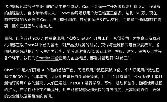 根据 OpenAI 官方公布的数据,ChatGPT 的周活跃用户数已突破9亿,个人订阅用户数超过 5000 万,更有超过 900 万付费企业用户依赖其开展工作,Codex 的周活用户也达到了 160 万。