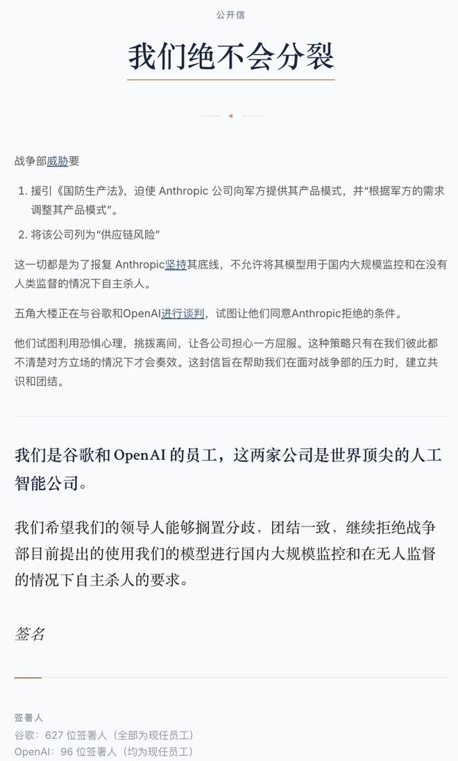 OpenAI 和谷歌员工纷纷站出来支持 Anthropic,并签署了一封题为「我们绝不会分裂」的公开信。