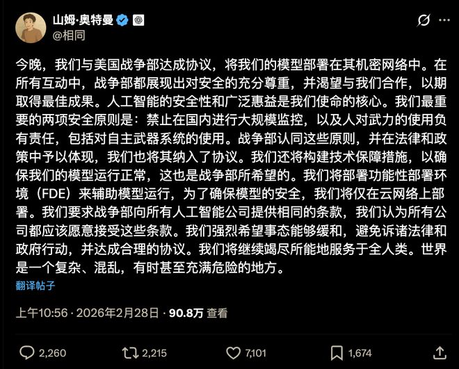 最近美国战争部刚刚将 Anthropic 拉入黑名单,转而 OpenAI 就趁机接下了这笔生意。OpenAI 设立了与 Anthropic 相同的安全红线,仅要求云端部署模型就获得了订单。