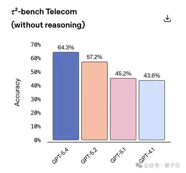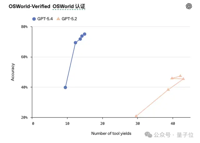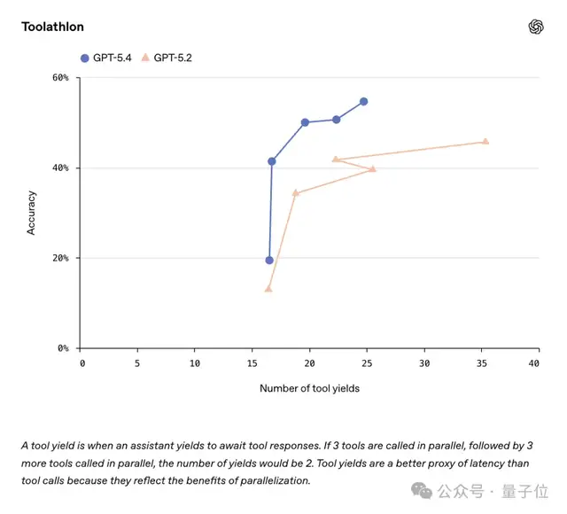在Toolathlon基准测试中,GPT-5.4取得54.6%的准确率,高于GPT-5.2的45.7%。