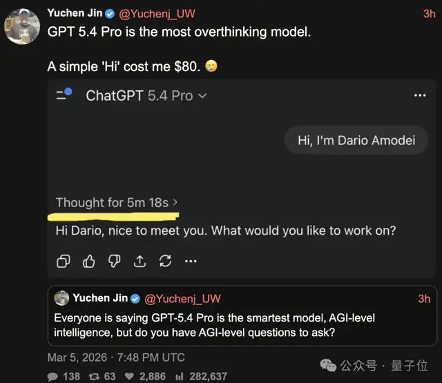 永远在冲浪一线的Yuchen Jin只是对GPT 5.4 Pro说了一句“Hi,俺是Anthropic创始人”,就花掉了整整560元……