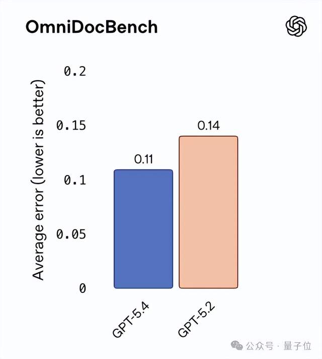 在OmniDocBench测试中,GPT-5.4的平均错误率从0.140下降到0.109。