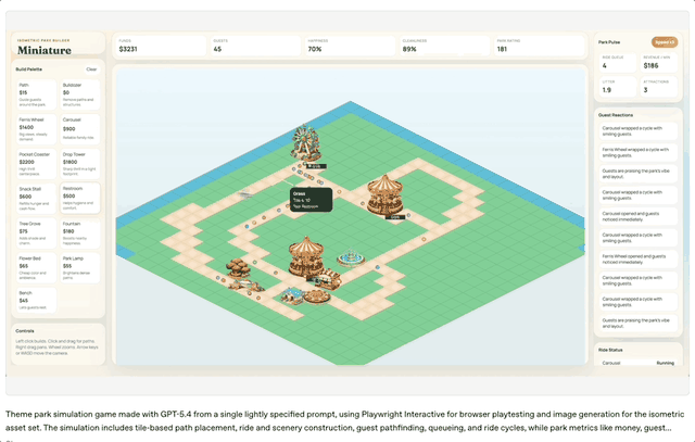 为了展示这一能力,OpenAI演示了一个由GPT-5.4生成的浏览器主题公园模拟游戏。