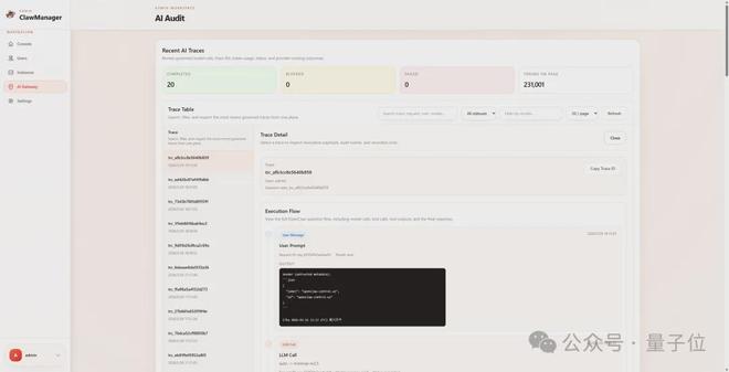 每一次LLM调用,都会产生唯一的trace_id,并被SSE流式响应同步持久化记录,事后可以按用户、模型或实例维度检索回溯。