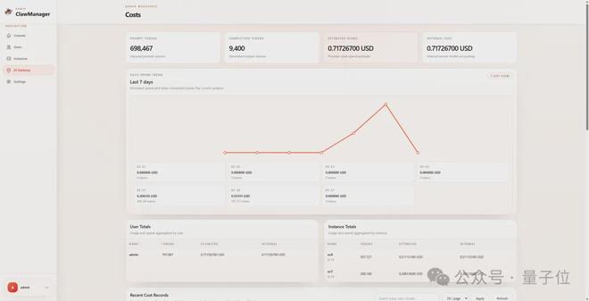 具体来说,ClawManager支持按照Prompt、Completion、Reasoning、Cached等不同类型的Token分类统计,还支持多币种计费,管理看板可以直观呈现费用波动。
