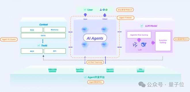 - 其四,配套AI安全护栏、Agent ID Guard身份管控与RAM身份体系,实现模型输入输出的风险拦截、企业员工与Agent权限的统一精细化管控,形成全流程防护闭环。
