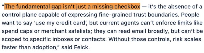 一个月前,Feick警告要把控制平面,嵌入OpenClaw这样的工具,而不是事后补充。