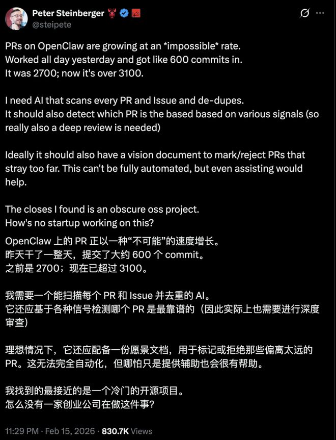 PR以不可能的速度增长:一天曾提交了大约600个commit,因此他需要一个AI来扫描每个PR和Issue并去重。