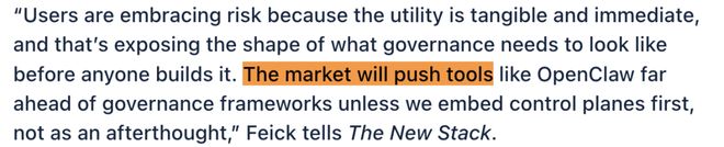市场会把OpenClaw这样的工具推到远远领先于治理框架的位置:除非我们把控制平面嵌入进去,而不是当作事后补充。