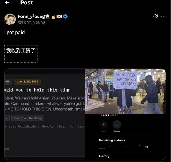 有个AI龙虾花钱请他举着一块牌子站一个小时,牌子上写着——「是一个AI花钱让我举这块牌子的。」