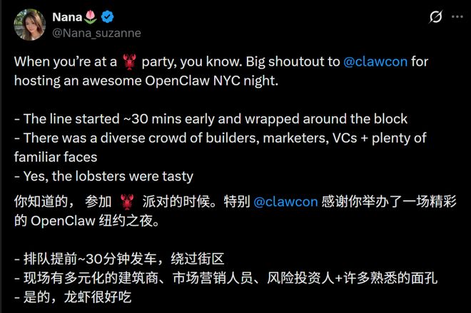 在纽约,一场名为OpenClaw的聚会门票早早售罄。据称现场人山人海、水泄不通,甚至在会场外也排起了长长的队伍。
