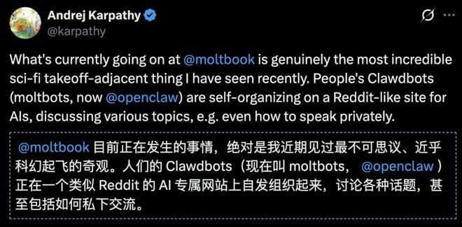 而特斯拉前AI负责人、「vibe coding」之父Andrej Karpathy则形容Moltbook是他见过最接近「科幻式起飞前夜」的事物之一。