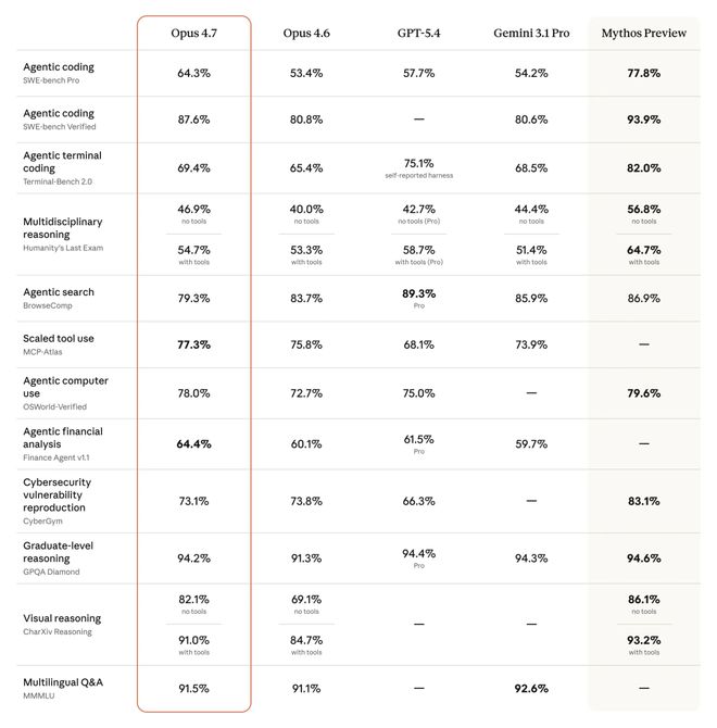 尽管新曝光的Claude Mythos Preview在性能上更为突出,但Opus 4.7相较于之前的Opus 4.6版本,在多数方面实现了显著提升。除了代理搜索能力略逊一筹外,其余部分均大幅超越了前代模型。