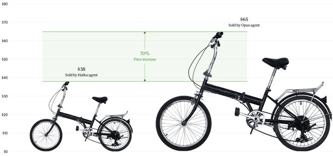 实验中,同一件商品通过不同的AI系统被卖出时,价格相差悬殊。例如,Haiku用户成交价为38美元,而Opus用户的售价则高达65美元。
