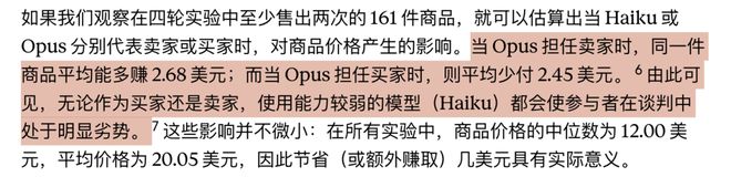 实验数据进一步证实了强弱模型之间显著的价格差异:Opus用户比Haiku用户多赚2.68美元,并且在面对Haiku买家时,Opus卖家可以卖出更高价格的商品。