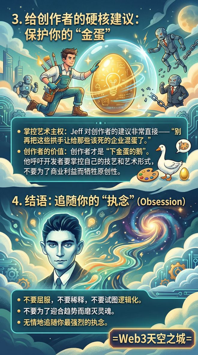 - Jeff 在回顾职业生涯中经历的成功与挫折时,鼓励年轻一代游戏开发者要敢于承担风险和暴露弱点。他认为创造伟大作品需要支持那些勇于冒险并不断进步的人们,并强调了在互联网上表达正面情感的重要性。