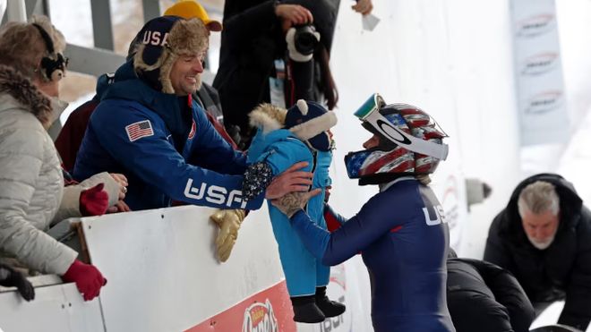 国际雪橇联合会世界锦标赛上的一张照片展示了美国雪车运动员Kaillie Armbruster Humphries怀抱新生儿的情景。