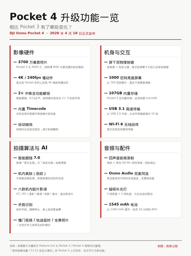 如果要用一句话总结 Pocket 4 的话,Pocket 4 就是 Pocket 3 的一次终极补强。