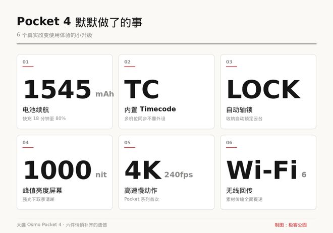 其实对于 Pocket3 老用户来讲,到这里也能看出来,没有任何一项是 Pocket 4 独有、Pocket 3 完全没有的颠覆。每一项都是 Pocket 3 已经在做、但被某个具体限制卡着没做透的事。Pocket 4 做的,是把那些限制一个一个拆掉。