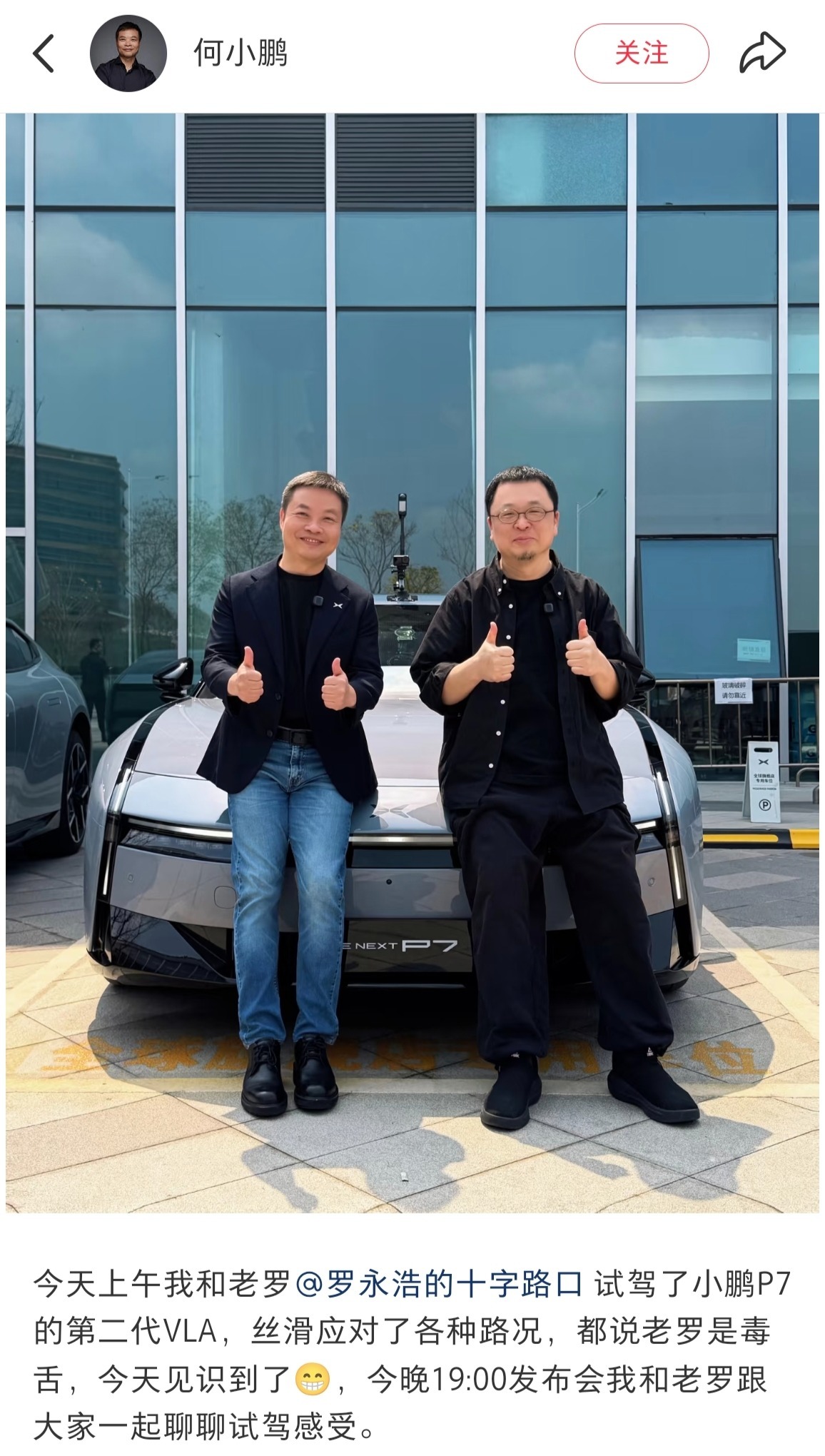 在何小鹏的详细介绍下,罗永浩参观了小鹏科技园的核心区域,包括了小鹏汽车的量产车型和关键技术布局,并且还亲自查看了小鹏汇天的飞行汽车等高科技产品。此外,两人还共同试驾了搭载第二代VLA技术的小鹏P7车型,对智能出行和低空科技领域的发展有了更深入的了解。
