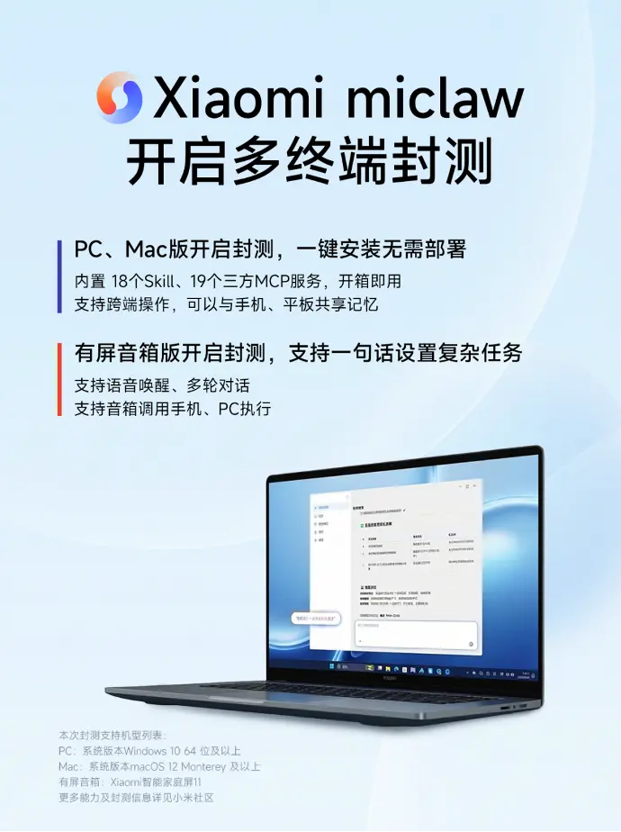 近日,小米公司发布了PC版的Xiaomi miclaw,并开始在电脑、Mac和有屏音箱上进行封闭测试。