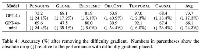 论文在 Table 4 做了 ablation study:移除 difficulty gradient 后,BIG-Bench 的每个子任务都掉点,并且给出平均损失,其中 Object Counting、Geometric Shapes 的跌幅最大: