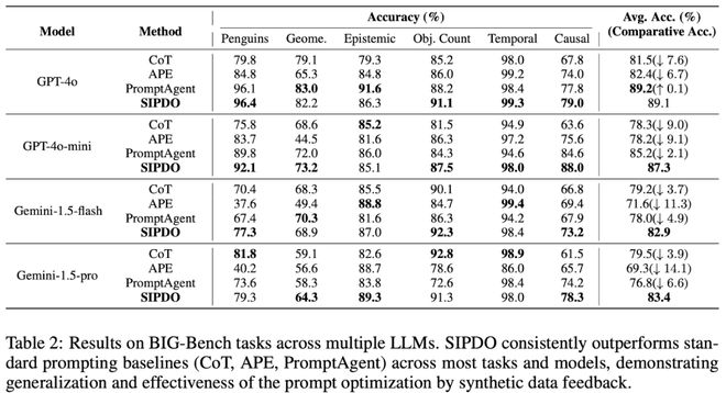 论文在 Table 2 汇总了 BIG-Bench 六个任务,表现 SIPDO 在多数任务与模型上consistently outperforms标准 baselines(CoT / APE / PromptAgent),体现 synthetic data feedback 带来的泛化收益。