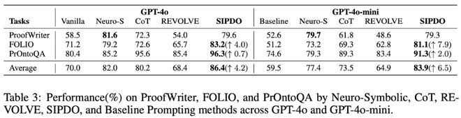 此外,论文还在 MMLU(College CS, Machine Learning, College Biology)以及 FOLIO / PrOntoQA / ProofWriter 等结构化推理任务上的对比与提升。SIPDO 的独特点在于:让系统主动生成 “刚好能打穿当前 prompt” 的合成样本,再用失败反馈驱动 prompt 修复,并通过难度递进持续加压。
