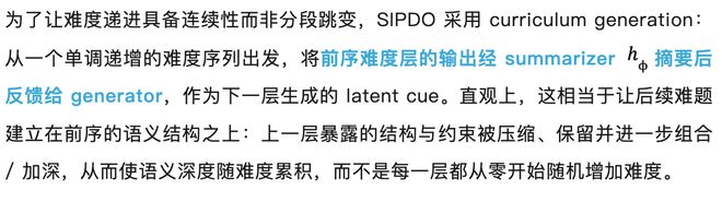 6.1.4 curriculum generation:用 summarizer 将上一层难度 “压缩成下一层线索”,形成语义累积
