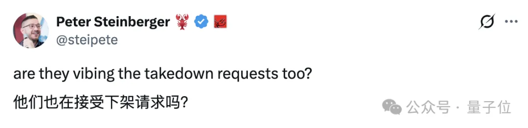 被称为龙虾之父的Peter更是现身评论区调侃此事,称Anthropic可能使用了自动程序执行下架操作。