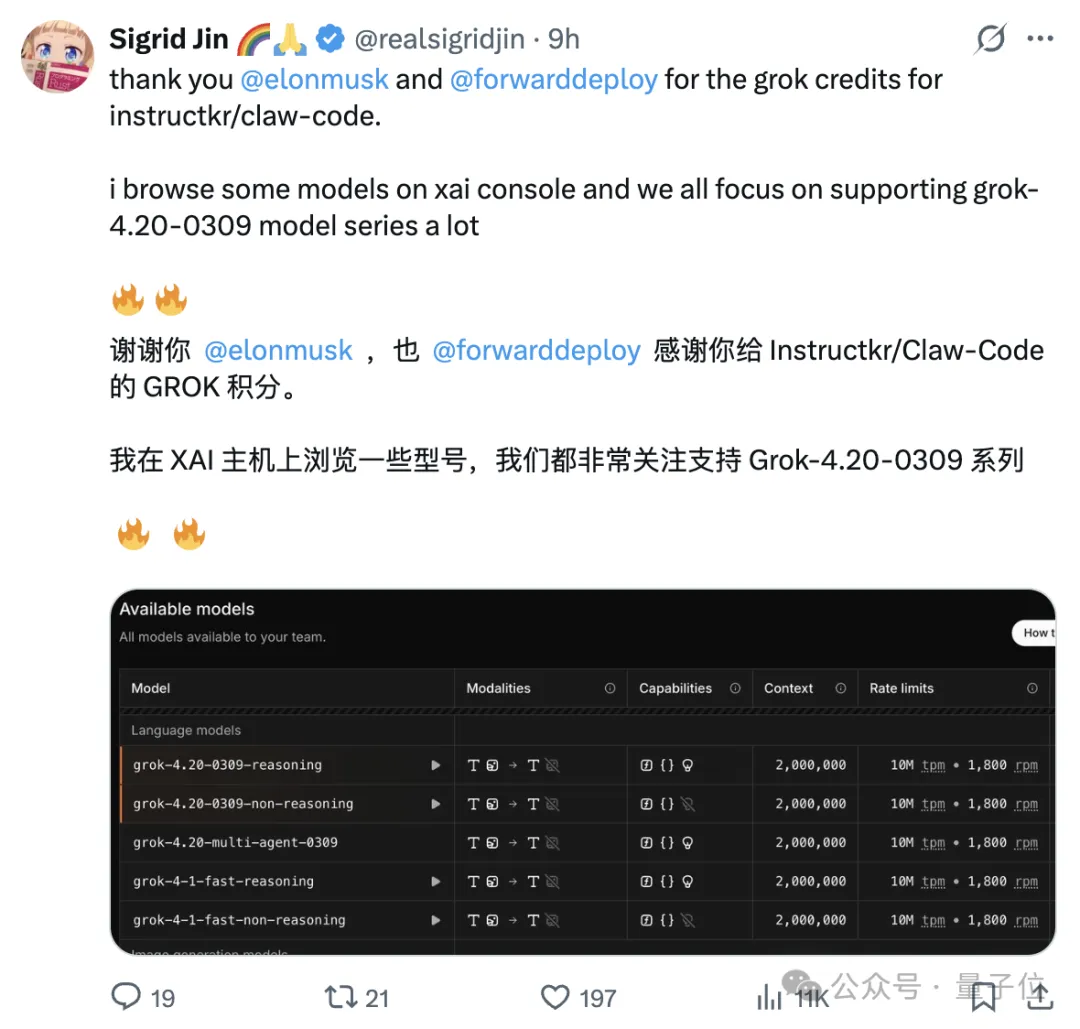 Jin专门发帖感谢马斯克,说xAI给他送了不少Grok积分,这对Claw Code的重写帮了大忙。